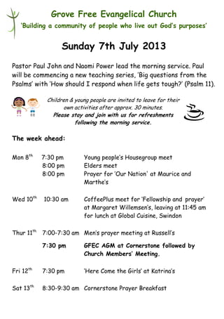 This document provides information about upcoming events and services at Grove Free Evangelical Church. On Sunday July 7th, Pastor Paul John will lead the morning service and commence a new teaching series on questions from the Psalms. Various church groups and prayer meetings are scheduled for the coming week. The Adventure Cruise Holiday Bible Club is scheduled in 3 weeks' time and volunteers are requested to pray for its preparation and administration.