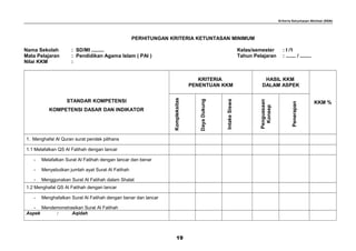 Dokumen ini menjelaskan kriteria ketuntasan minimal (KKM) untuk mata pelajaran Pendidikan Agama Islam dari kelas 1 hingga kelas 3, dengan fokus pada penguasaan Al-Qur'an, aqidah, akhlak, dan fiqh. Setiap kelas memiliki standar kompetensi, kompetensi dasar, dan indikator yang harus dicapai oleh siswa, serta cara penilaian untuk mengukur pencapaian tersebut. KKM ditetapkan berdasarkan berbagai aspek, seperti hafalan, pengenalan, dan penerapan dalam konteks sehari-hari.