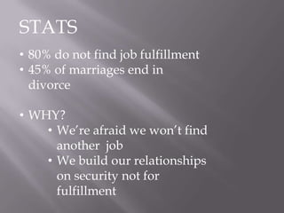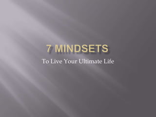 This document outlines seven mindsets for living an ultimate life: everything is possible, passion first, we are all connected, 100% accountable, attitude of gratitude, live to give, and the time is now. It notes statistics about lack of job fulfillment and divorce rates, and discusses how limiting beliefs and insecurity rather than passion and fulfillment drive many relationships and careers. Each mindset is then explained, emphasizing believing anything is possible, following your passions, serving others, taking responsibility for your life through thoughts and actions, having gratitude, and taking inspired action in the present.