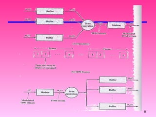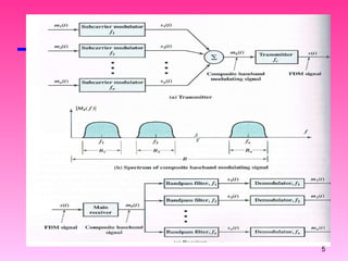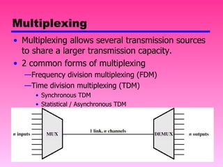 Multiplexing allows multiple transmission sources to share a larger transmission capacity through techniques like frequency division multiplexing (FDM) and time division multiplexing (TDM). FDM allocates different carrier frequencies to different signals so they do not overlap. TDM interleaves multiple digital signals in time by assigning fixed time slots. Statistical TDM dynamically allocates time slots based on demand to make more efficient use of bandwidth compared to synchronous TDM which allocates slots even if they are empty.