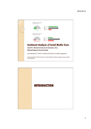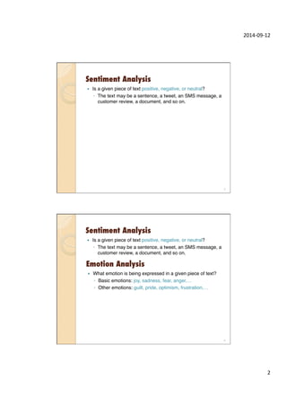 This document provides an overview of sentiment analysis and its applications. It discusses sentiment analysis tasks like classifying text sentiment and identifying aspect-level sentiment. It also covers social media texts and their characteristics. Several SemEval shared tasks on sentiment analysis are described, including tasks on classifying tweets and aspects in reviews. The document concludes with a brief discussion of sentiment analysis features.