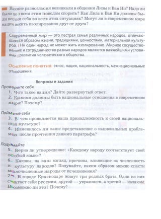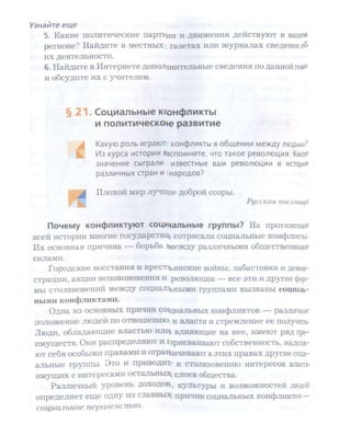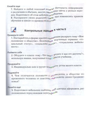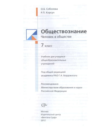 Учебник по обществоведению для 6 класса знакомит учеников с жизнью человека в обществе и государстве, включая такие темы, как социальная структура, группы и потребности человека. Он содержит рубрики, вопросы и задания, помогающие активизировать знания и развивать мышление, а также включает афоризмы и примеры из реальной жизни. Авторы надеются, что учебник будет интересным и полезным для понимания современного мира.