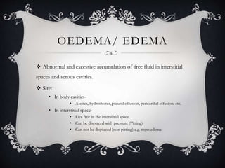 Oedema, also known as edema, is the abnormal accumulation of fluid in the interstitial spaces or body cavities. It can occur locally in specific areas like the lungs or abdomen, or systemically throughout the body. Oedema is classified as either transudative or exudative based on its fluid composition, and as pitting or non-pitting based on whether the fluid can be displaced by pressure. The main causes of oedema are increased hydrostatic pressure, reduced plasma oncotic pressure, lymphatic obstruction, and inflammation.