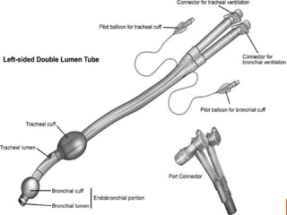 One Lung Ventilation (OLV) is a technique used during thoracic surgery to isolate one lung allowing it to function independently. There are several methods to achieve OLV including using a double lumen endotracheal tube, Univent tube, or endobronchial blockers. OLV provides benefits like protecting the healthy lung during surgery on the other lung but also causes physiological changes and risks like hypoxemia. Care must be taken to properly position the lung isolation device and monitor for complications during OLV.