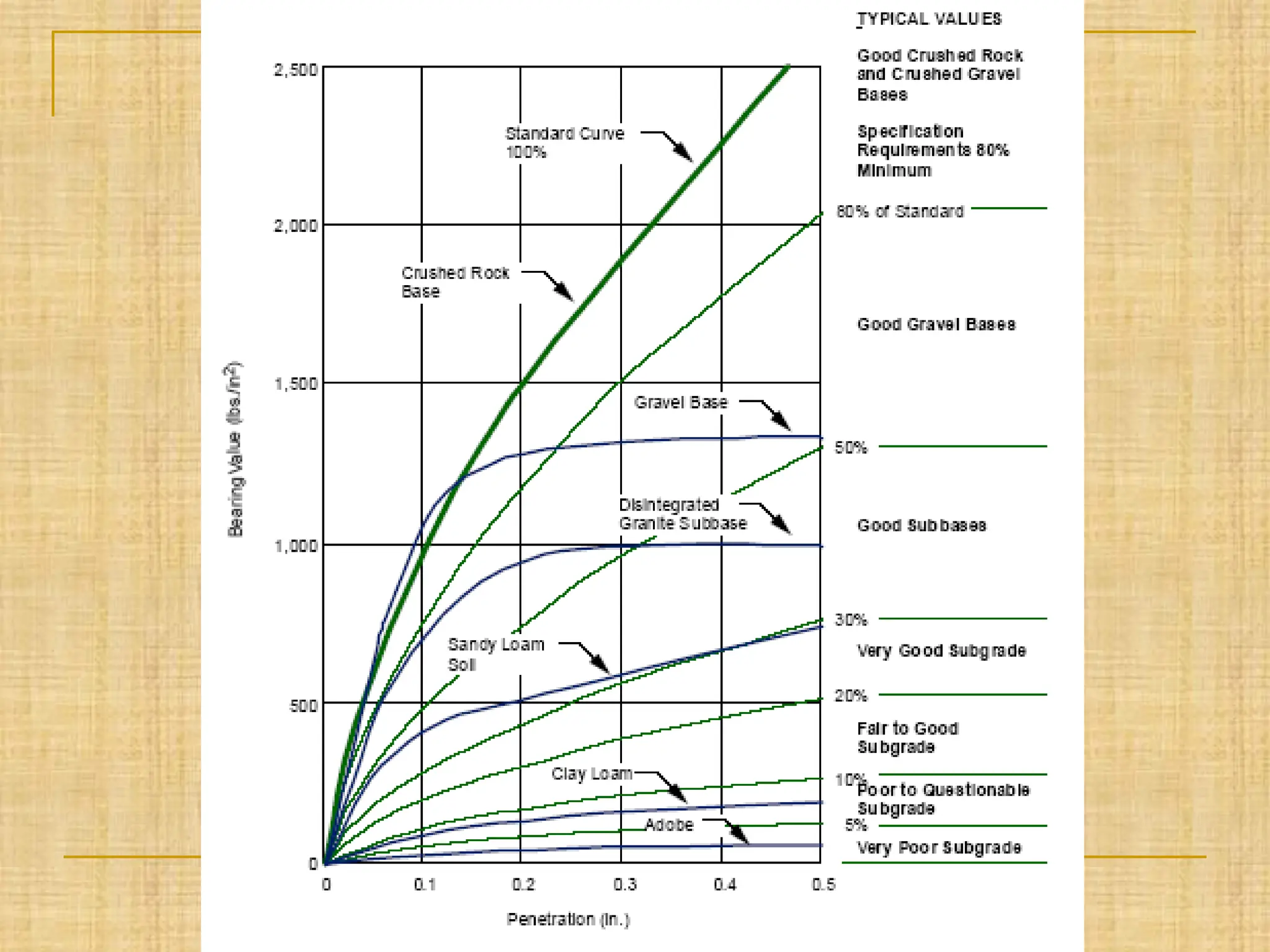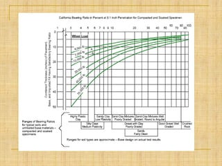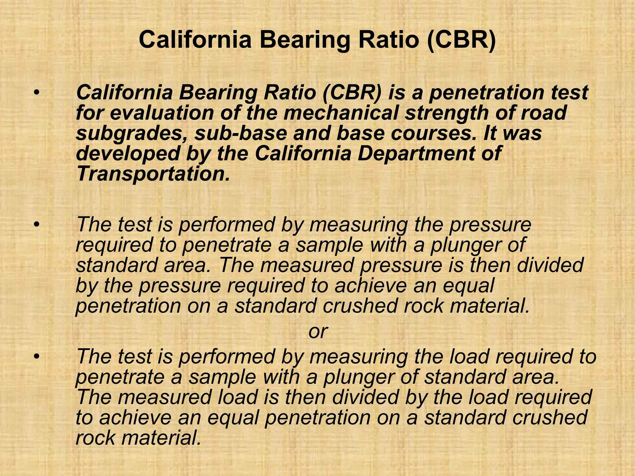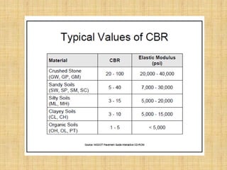 The California Bearing Ratio (CBR) test measures the mechanical strength of soils and pavement materials. It involves measuring the load or pressure required to penetrate a sample with a standard plunger at specific depths. The measured load is divided by the standard load on a crushed rock material to determine the CBR value. Higher CBR values indicate stronger, higher quality materials. CBR tests are used to design pavement structures and determine thicknesses of pavement layers needed to support anticipated traffic loads.