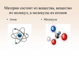 Документ описывает основные принципы молекулярной физики, включая строение веществ и их агрегатные состояния: твердые тела, жидкости, газы и плазму. Он объясняет движение частиц в этих состояниях, их взаимодействие и свойства, а также вводит молекулярно-кинетическую теорию, акцентируя внимание на беспорядочном движении молекул и их тепловых характеристиках. Кроме того, рассматриваются концепции массы, объема и броуновского движения частиц.