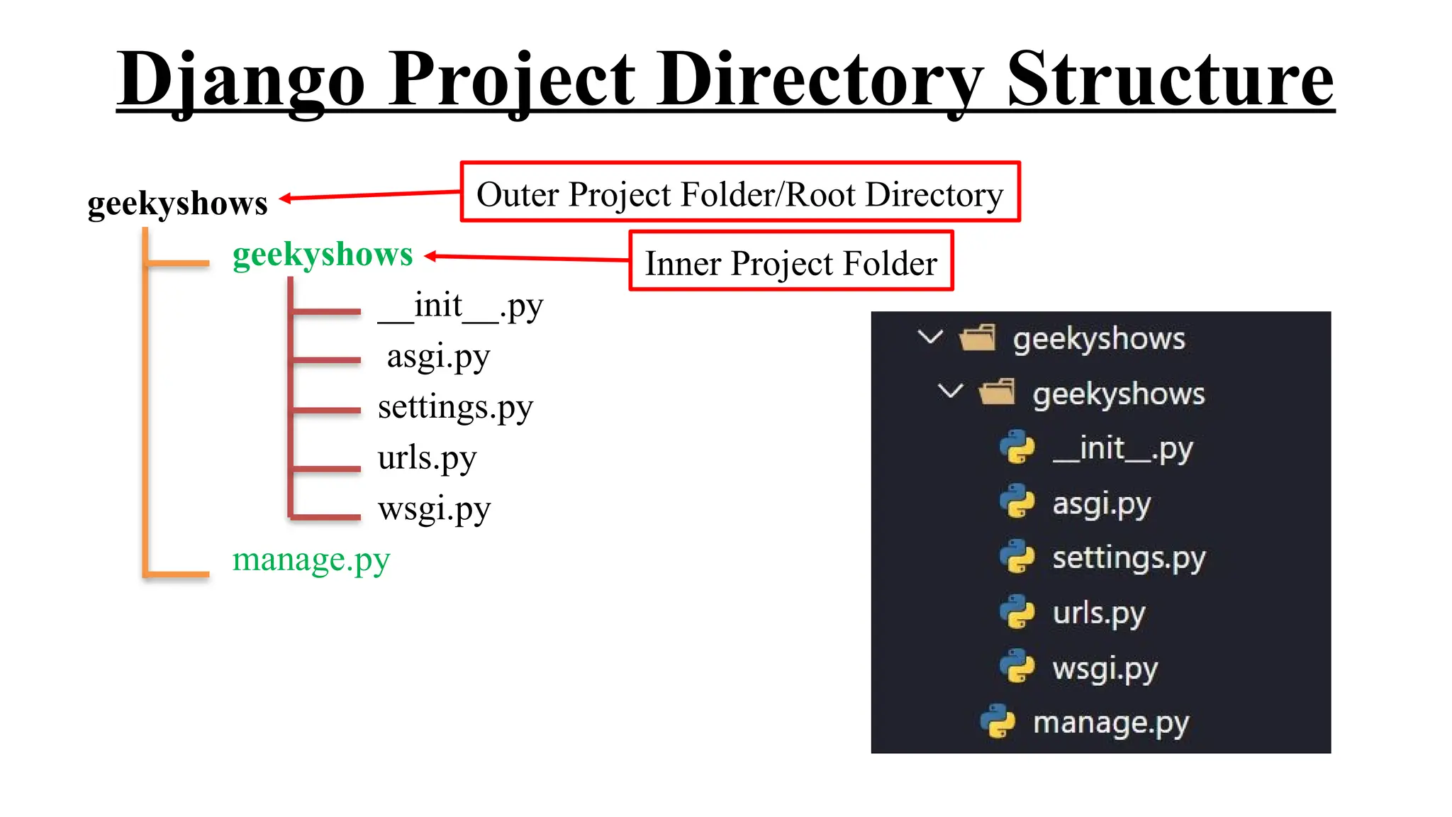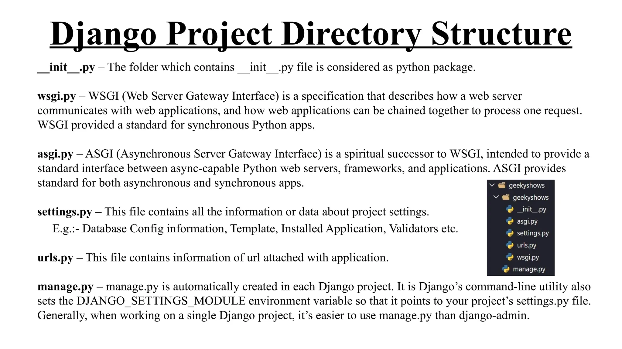 The document outlines the structure and essential files in a Django project, including key files such as __init__.py, wsgi.py, asgi.py, settings.py, urls.py, and manage.py. It provides details on the configuration and purpose of each file, focusing on settings for databases, middleware, applications, and security features like the secret key and debugging options. Overall, it serves as a comprehensive guide to understanding the setup and functioning of a Django project.