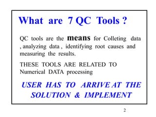 The document provides information on seven quality control tools: Why-Why Analysis, What-If Analysis, Pareto Diagram, Cause and Effect Diagram, Stratification, Check Sheet, and Control Chart/Graph. It defines each tool, explains how and when each is used, and what results can be obtained from their use. The tools help collect and analyze data to identify root causes of problems and measure the effectiveness of solutions.