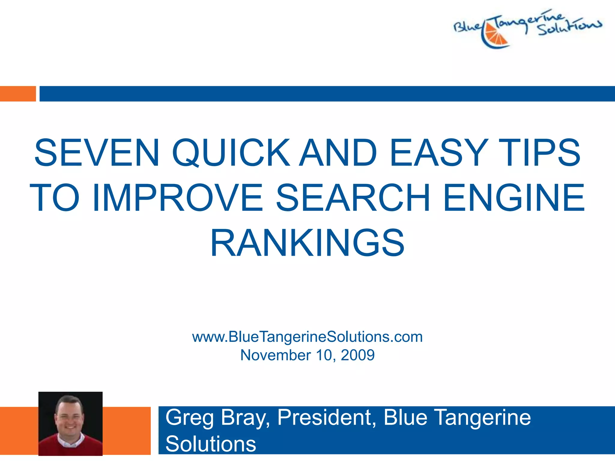 This document provides 7 tips for improving search engine rankings: 1) Monitor keywords and measure performance, 2) Avoid duplicate content, 3) Include keywords in content, 4) Use keywords in titles and links, 5) Get links from other sites, 6) Create an XML sitemap, and 7) Submit the site to search engines. It also defines search engine optimization and discusses the importance of visitors, ongoing optimization efforts, and differences between search engines.