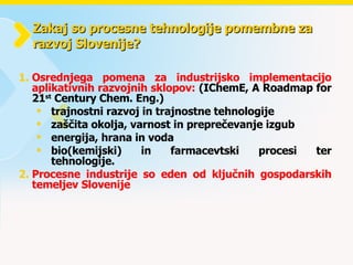 Zakaj so procesnetehnologije pomembne za razvoj Slovenije? Osrednjega pomena za industrijsko implementacijo aplikativnih razvojnih sklopov: (IChemE, A Roadmap for 21 st Century Chem. Eng.) trajnostni razvoj in trajnostne tehnologije zaščita okolja, varnost in preprečevanje izgub energija, hrana in voda bio(kemijski) in farmacevtski procesi ter tehnologije. Procesne industrije so eden od ključnih gospodarskih temeljev Slovenije