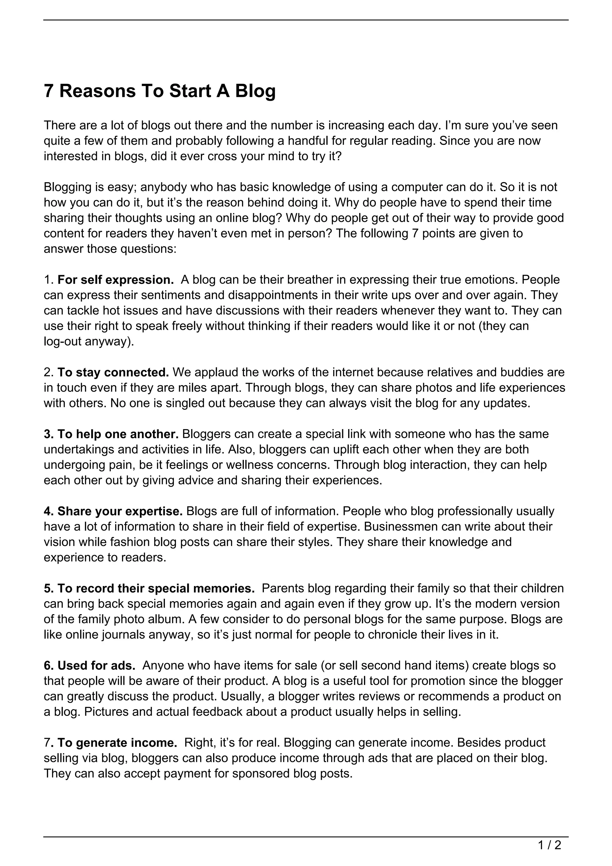 There are 7 reasons to start a blog: 1) For self-expression and freely discussing issues with readers, 2) To stay connected with friends and family by sharing photos and experiences, 3) To help others going through similar experiences by giving advice, 4) To share expertise in a particular field, 5) To record special memories for family, 6) To promote and sell products, 7) To potentially generate income through ads, sponsored posts, or articles. Blogging allows anyone to share their thoughts online and connect with others around the world.