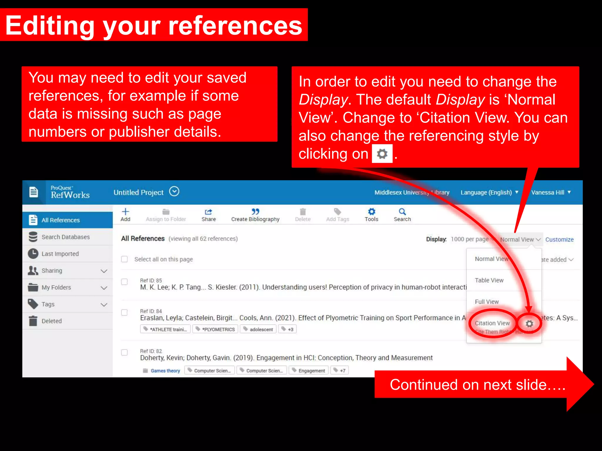 This document discusses how to edit references in RefWorks. It explains that you need to change the display to "Citation View" to see what information is missing from references. Fields highlighted in blue are "possibly required" and yellow are "required" by the chosen referencing style. You can then click on a reference to open it for editing and add missing details. It also provides other editing options like manually editing fields or getting suggestions to help fill them in.