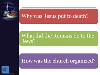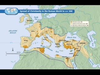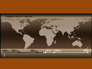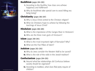 The document summarizes the origins and early spread of several major world religions. It discusses how Hinduism evolved over centuries in India with beliefs in reincarnation and karma. It describes the life of Siddhartha Gautama and how he founded Buddhism after achieving enlightenment, rejecting the Hindu caste system. Buddhism then spread from India to other parts of Asia via traders. The document also outlines the origins of Judaism among the Hebrew people in Canaan and their covenant with God. It provides an overview of Confucianism in China and how Confucius promoted order, education, and ethics. Finally, it summarizes the life and missionary work of Paul in spreading Christianity despite persecution by Romans who saw