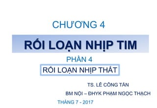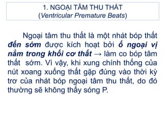 Tài liệu trình bày về rối loạn nhịp thất, cụ thể là ngoại tâm thu thất và nhịp nhanh thất. Ngoại tâm thu thất là một nhát bóp thất đến sớm do xung ngoại vị và có thể xuất phát từ nhiều nguyên nhân như nhồi máu cơ tim, viêm cơ tim hay rối loạn điện giải. Nhịp nhanh thất có tần số từ 120-240 ck/ph và có thể phát sinh từ nhiều nguyên nhân, thường được chẩn đoán qua điện tâm đồ và có thể được điều trị bằng sốc điện hoặc thuốc chống loạn nhịp.