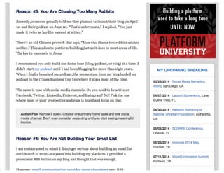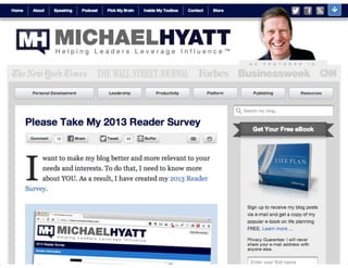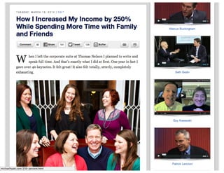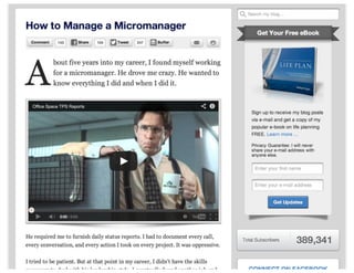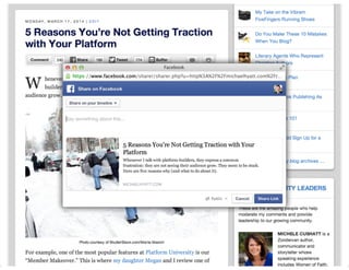 This document outlines 7 rules for writing blog posts that get read and shared. The rules are to 1) focus on the reader by understanding their demographics and psychographics, 2) speak in an authentic voice such as a sage, sherpa, or struggler, 3) create a powerful headline using techniques like numbered sequences or provocative questions, 4) include a relevant photo to illustrate the post, 5) lead with a personal story that is vulnerable and distills a principle, 6) write scannable copy using formatting like subheads and bullets, and 7) make posts easy to share by adding social sharing plugins. Following these 7 rules can help bloggers improve engagement for their posts.