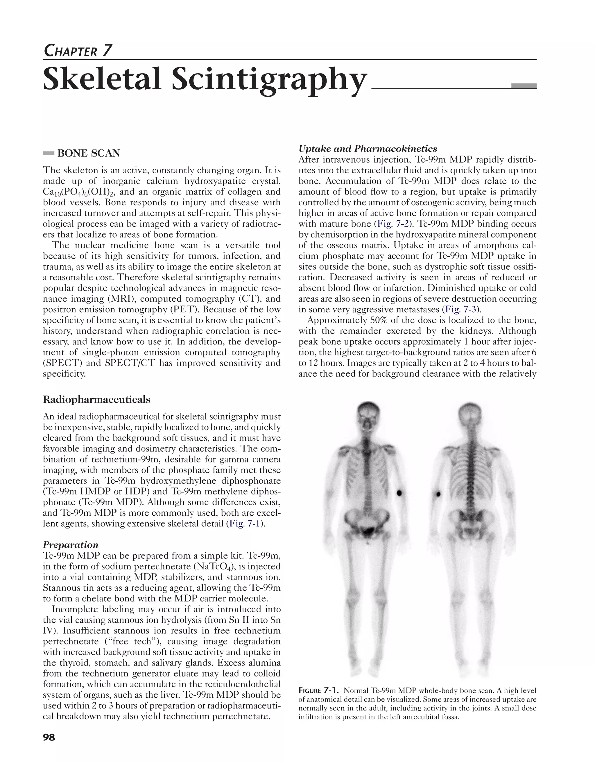 The document summarizes skeletal scintigraphy (bone scan) imaging. It describes how bone scan works by using radiotracers that localize to areas of bone formation/turnover. Technetium-99m methylene diphosphonate (Tc-99m MDP) is commonly used as it rapidly distributes to bone and is cleared from soft tissues. Imaging involves whole body scans 2-4 hours later to visualize bone abnormalities indicative of tumors, fractures or infections. Single photon emission computed tomography (SPECT) provides three-dimensional localization of lesions and improved specificity when fused to CT images. The distribution of uptake in normal bone changes with age and osteoarthritic changes are common benign findings.
