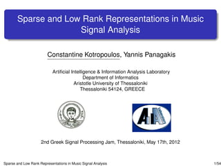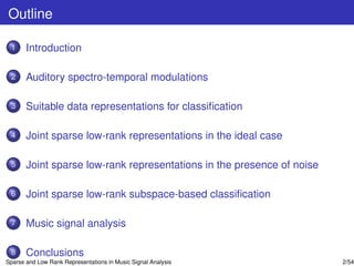 The document discusses sparse and low-rank representations in music signal analysis, highlighting techniques for music genre classification and structure analysis through audio signal extraction. It also examines auditory spectro-temporal modulations and proposes methods for automatic music tagging. The presentation outlines various data representation methods and their application in improving classification performance in music analysis.