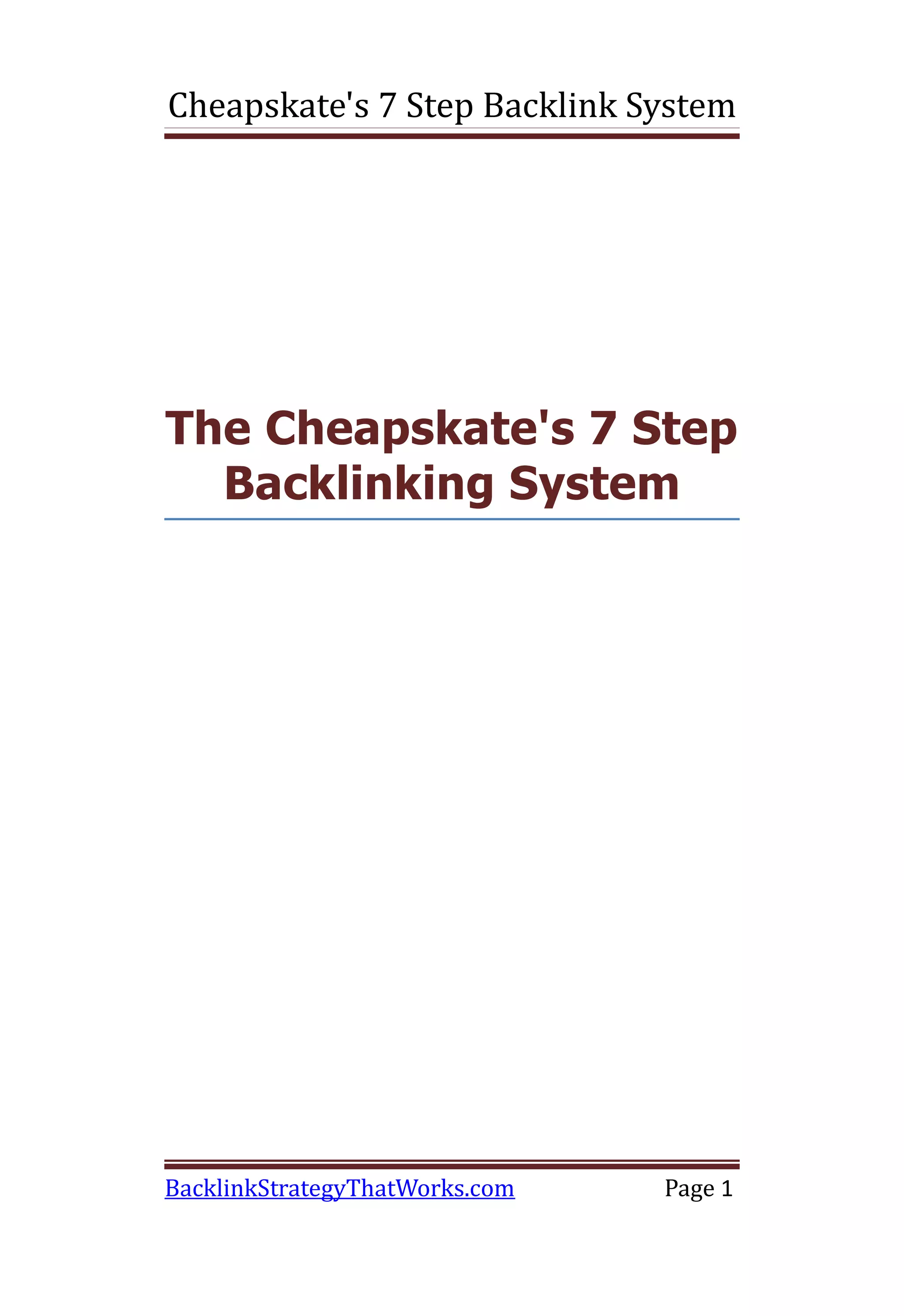 The document outlines a 7 step process for building targeted backlinks to increase website traffic. Step 1 involves optimizing website content for targeted keywords. Step 2 is writing unique content and submitting to article directories to build backlinks. Step 3 is building blogs and linking them to the main website to build more backlinks. The process aims to build backlinks through natural linking methods rather than paid links or software.