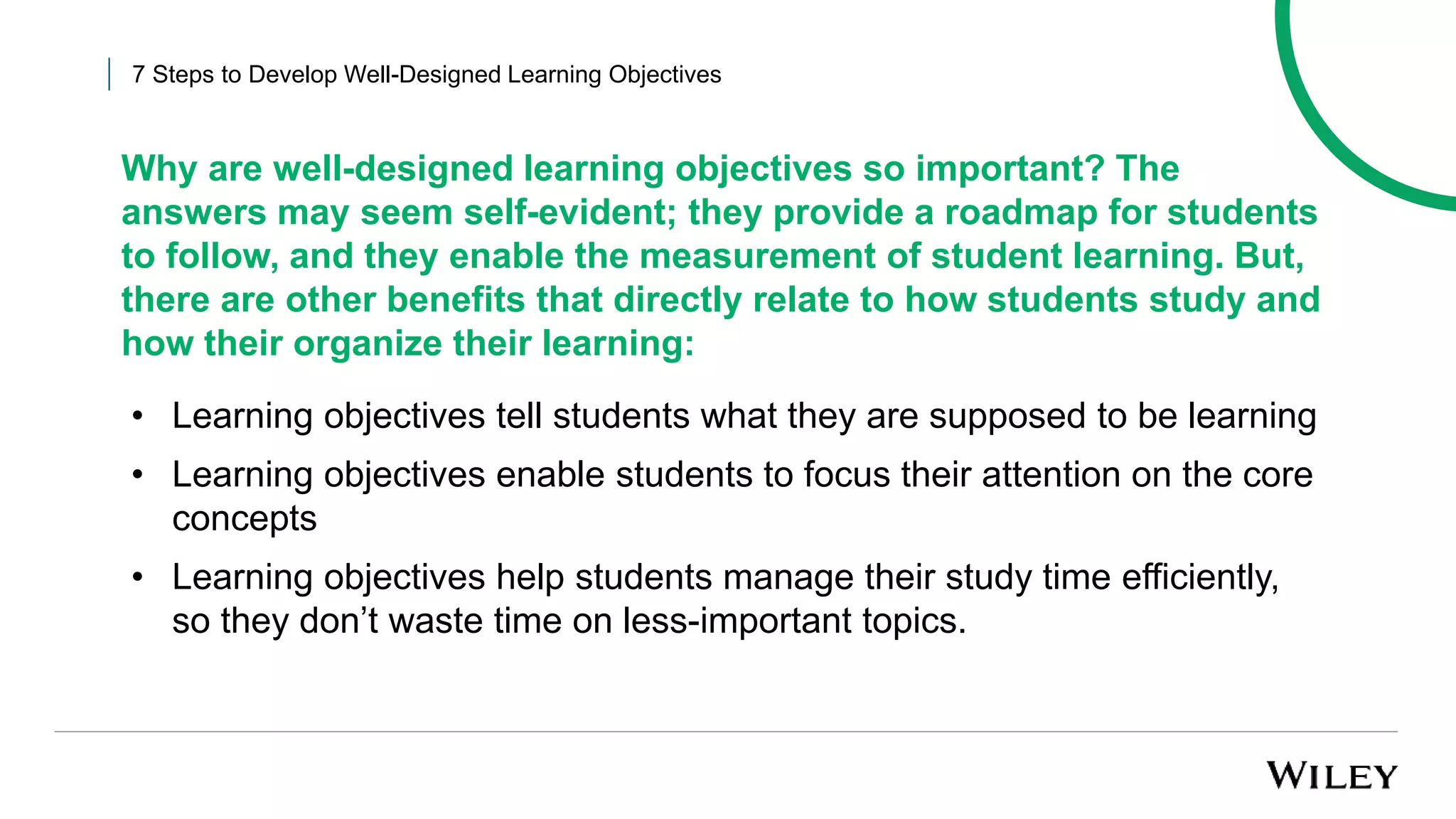 The document outlines 7 steps to develop well-designed learning objectives: 1) be clear about what is expected of students, 2) connect objectives to program and college goals, 3) use active verbs to describe desired outcomes, 4) consider Bloom's taxonomy for appropriate knowledge levels, 5) emphasize higher-order thinking for advanced courses, 6) organize teaching materials to align with objectives, and 7) limit the number of objectives to allow for efficient assessment. Well-designed objectives provide a roadmap for students, enable measurement of learning, and help students study efficiently.