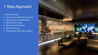 The document outlines a seven-step approach to threat modeling, focusing on identifying assets, creating architectural overviews, decomposing applications, identifying and documenting threats, rating them, and generating work item reports. It utilizes the STRIDE model for threat identification and the DREAD model for threat rating, emphasizing the importance of countermeasures and prioritizing threats for mitigation. The document also includes examples of potential threats and countermeasures, such as SQL injection and credential monitoring.