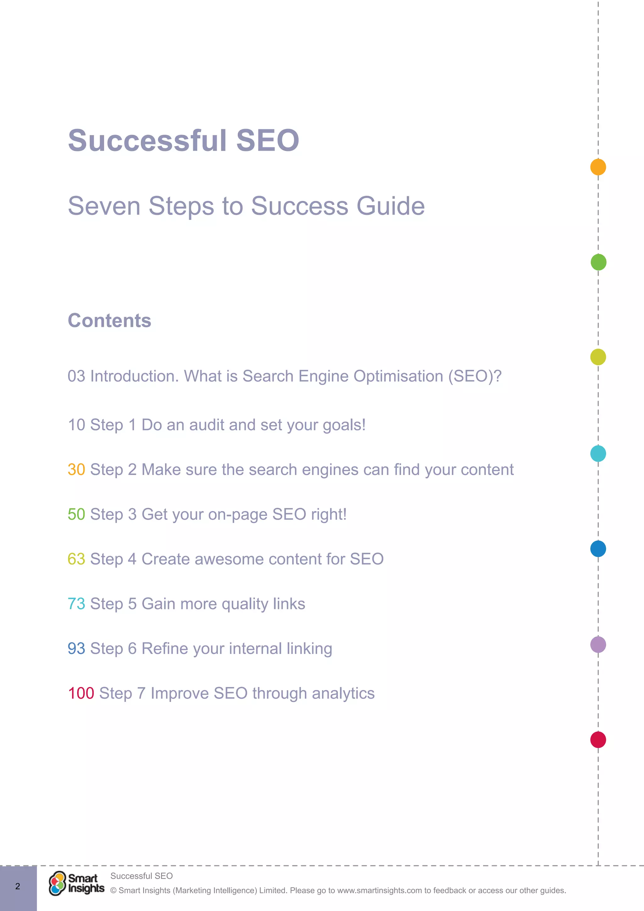 This document provides a 7-step guide to successful SEO. It begins with an introduction that defines SEO and its importance for driving traffic. It explains that the two most important ranking factors are the quality of links to a page and site. The guide then covers each of the 7 steps: 1) setting goals and doing an audit, 2) making content discoverable, 3) on-page optimization, 4) creating content, 5) gaining quality links, 6) refining internal linking, and 7) using analytics. It emphasizes that SEO requires a proactive approach and focuses on quality over quantity. The landscape is always changing, so practitioners must stay up to date on algorithm updates.