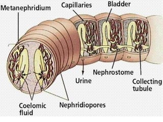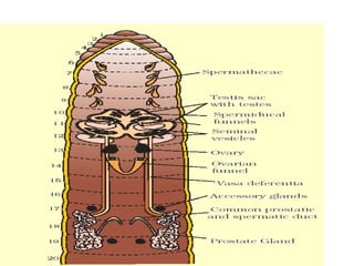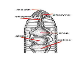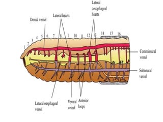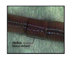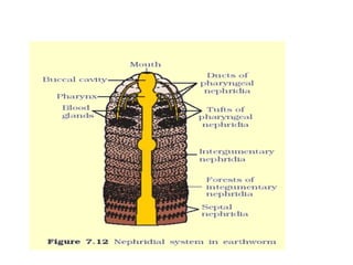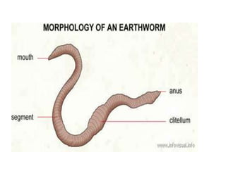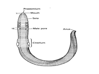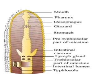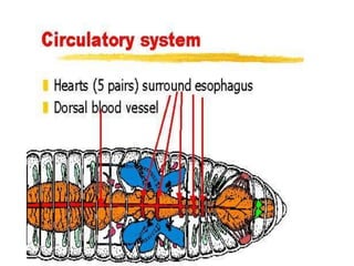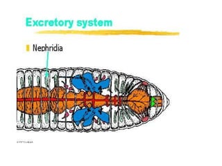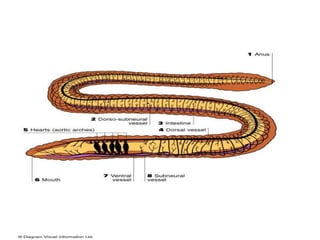 3) The excretory system includes nephridia and nephridiopores. Earthworms are hermaphrodites with both male and female reproductive organs.
