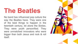 The Beatles were one of the most influential bands in pop culture history. As musicians, they innovated rock music by embracing a wide variety of sounds and styles in their recordings. As personalities, they helped define 1960s counterculture by being smart, playful, and irreverent. Their songwriting partnership of Lennon and McCartney produced hits that set new standards for commercial and artistic success in pop music.