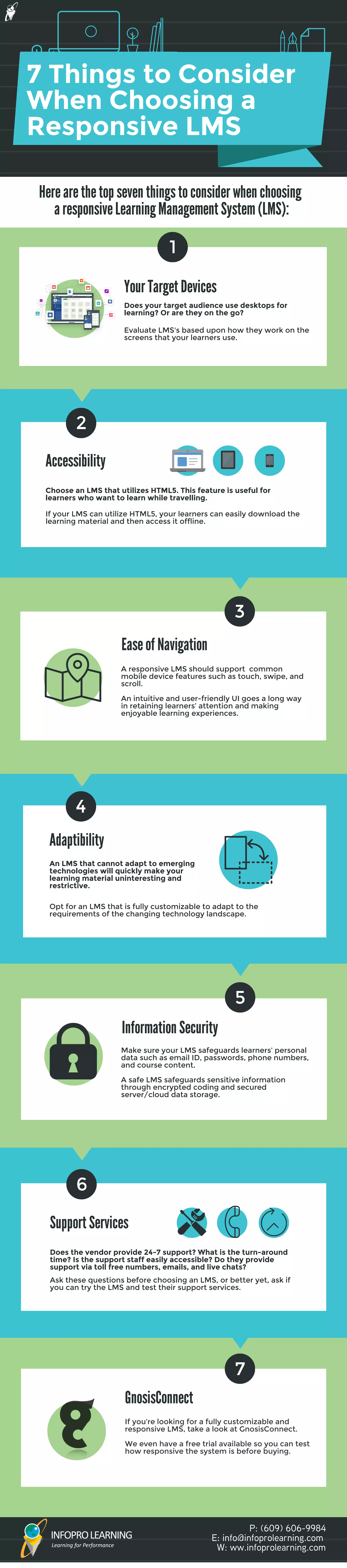 The document outlines seven key considerations for selecting a responsive learning management system (LMS), including target devices, accessibility through HTML5, ease of navigation, adaptability to new technologies, information security, vendor support services, and mentions GnosisConnect as a customizable LMS option with a free trial. It emphasizes the importance of choosing an LMS that caters to learners' needs and the evolving technology landscape. Ensuring 24-7 support and safeguarding personal data are critical factors in the decision-making process.