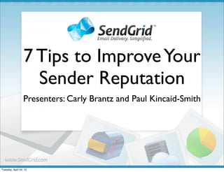 The document provides 7 tips to improve email sender reputation: 1) Minimize complaints from recipients, 2) Send relevant content that recipients want, 3) Send emails at a consistent volume, 4) Keep bounce rates low by removing invalid addresses, 5) Stay off blacklist lists, 6) Avoid spam traps, and 7) Let an expert like SendGrid handle the technical infrastructure to ensure best practices are followed. The webinar presentation was given by Carly Brantz and Paul Kincaid-Smith of SendGrid.