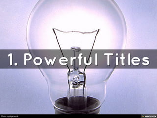 The document provides 7 tips for writing great blog posts, including using powerful titles that grab attention, starting with a strong introductory paragraph, keeping paragraphs short with bulleted content, including subheadings to break up sections, adding clickable links, incorporating visual content, and concluding with a call to action for readers to engage further.