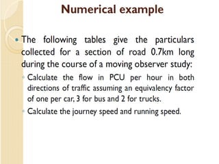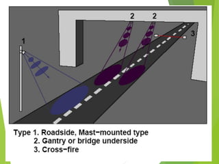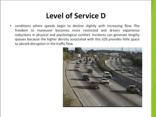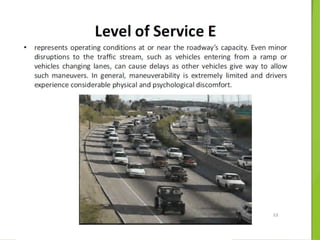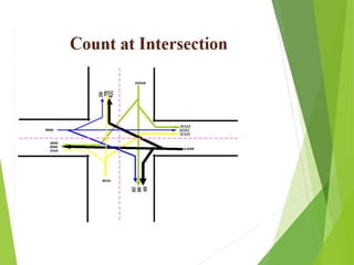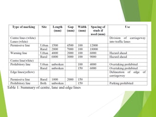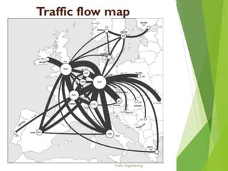 This document provides an overview of traffic engineering, including its scope and key areas. It discusses traffic characteristics like road users, vehicles, and the environment. It covers traffic flow studies, operation and regulation, design of intersections and signs. It describes the human-vehicle-environment system and factors like user perception, age, vision that influence traffic. It also summarizes traffic management through regulation, control devices like signs and road markings, and their design considerations.
