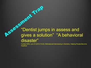 The document discusses 7 common traps that dentists fall into when treating patients: 1) The assessment trap of jumping straight into assessing the problem without understanding the patient's perspective. 2) The expert trap of focusing on giving solutions without involving the patient. 3) The treatment plan trap of making a plan without the patient's input and understanding. 4) The pre-mature focus trap of focusing on fixing the problem before understanding the patient's reasons. 5) The labeling trap of judging or grouping patients without considering individual circumstances. 6) The blaming trap of blaming patients for their conditions or lack of compliance. 7) The chat trap of getting stuck in small talk instead of discussing health issues