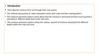 The document discusses the mechanisms and factors influencing water absorption in plants, emphasizing the role of root systems and moisture extraction patterns. It distinguishes between active and passive absorption processes, detailing how factors like soil type, water concentration, and temperature affect water uptake. Additionally, it highlights the importance of rooting characteristics in determining moisture availability and discusses the overall significance of water movement within the soil-plant-atmospheric system.