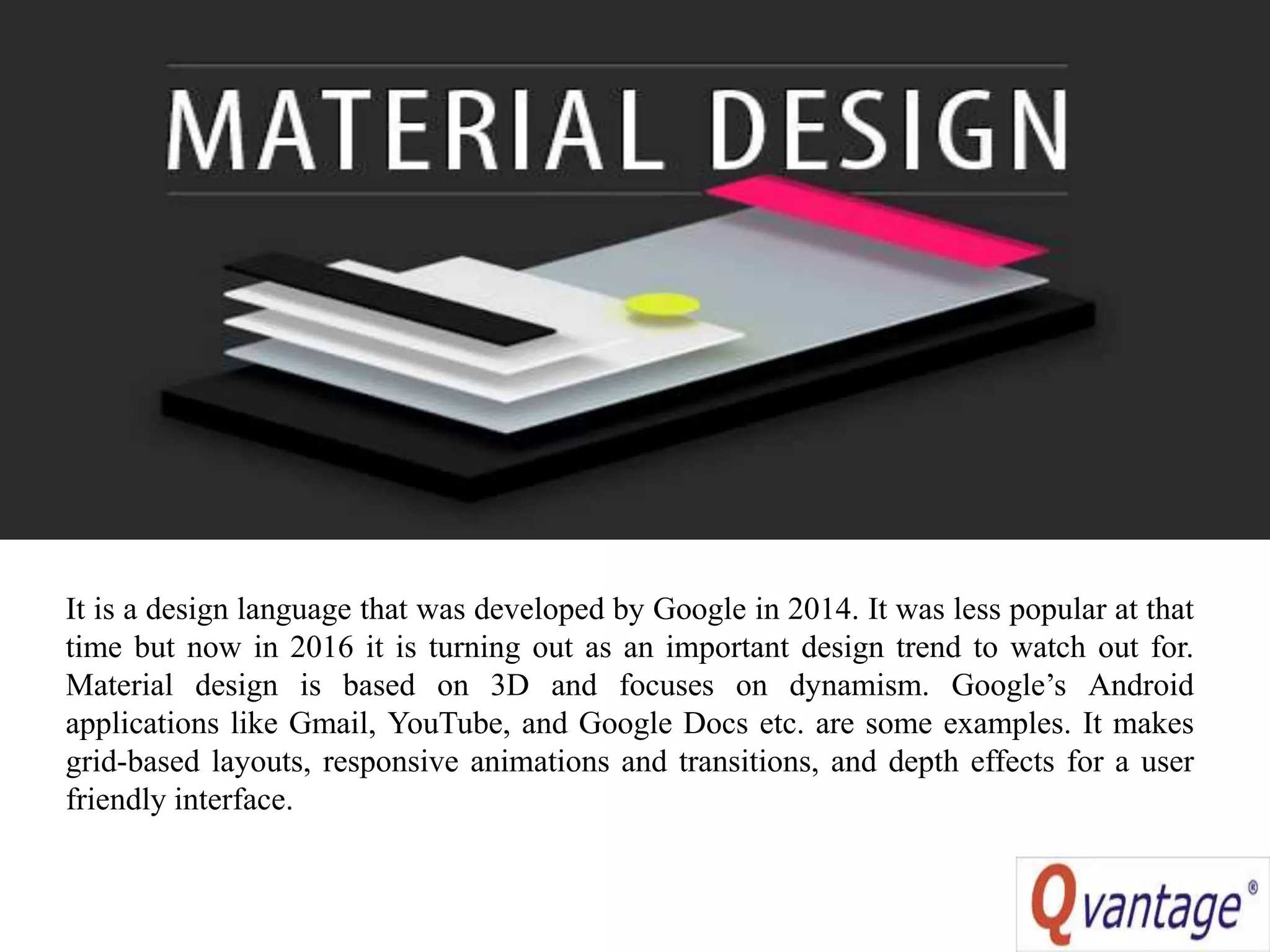 The document discusses the evolution and importance of design trends, particularly highlighting Google's Material Design launched in 2014, which focuses on 3D elements and user-friendly interfaces. It also emphasizes the significance of flat design, card layouts, bold typography, animations, cinema graphs, and responsive design in improving user experience, especially on mobile devices. Overall, these trends reflect a shift towards minimalistic and engaging web designs that enhance usability and accessibility.