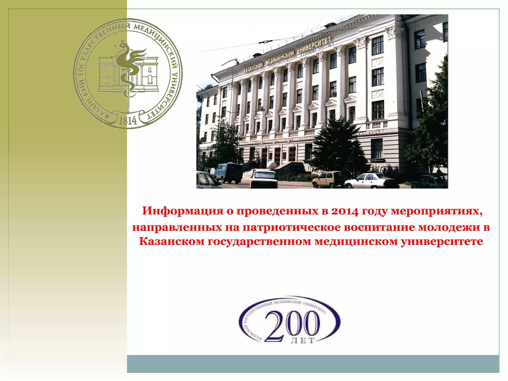 Документ описывает мероприятия, проведенные в 2014 году в Казанском государственном медицинском университете, направленные на патриотическое воспитание молодежи. Среди мероприятий - митинг, парад победы, военно-патриотическая эстафета, конференции и поисковые экспедиции. Также упоминается работа над сборниками воспоминаний и историей медицины, связанной с Великой Отечественной войной.