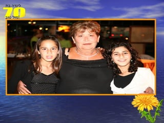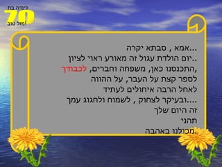 אמא , סבתא יקרה ... יום הולדת עגול זה מאורע ראוי לציון .. התכנסנו כאן , משפחה וחברים , לכבודך , לספר קצת על העבר , על ההווה לאחל הרבה איחולים לעתיד ובעיקר לצחוק , לשמוח ולחגוג עמך .... זה היום שלך תהני מכולנו באהבה . .