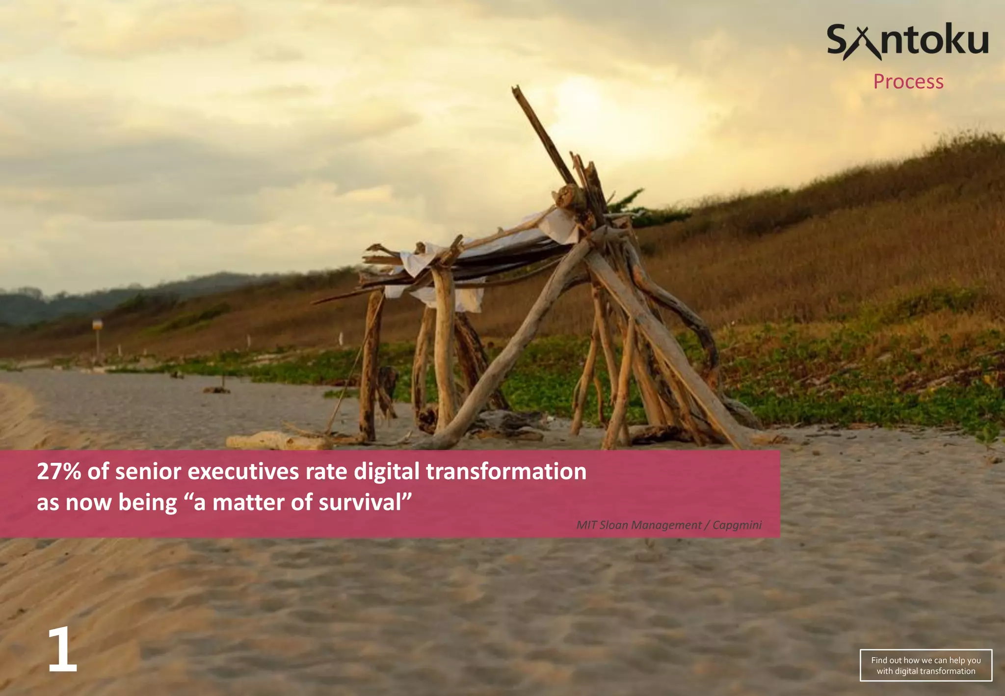 The document summarizes statistics related to digital transformation from various sources. Some key findings include: 27% of senior executives see digital transformation as critical for survival; 90% of companies lack suitable digital skills; and over 60% of CMOs feel that rising consumer experience expectations significantly impacts marketing strategy.