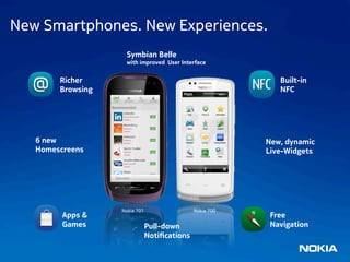 Nokia introduces two new smartphones, the Nokia 700 and Nokia 701, featuring the Symbian Belle OS with enhanced browsing and customizable homescreens. Both devices prioritize eco-friendliness with sustainable materials and energy efficiency, while offering powerful hardware like 1GHz processors and NFC capabilities. Key features include vibrant designs, 5MP and 8MP cameras, and access to a wide range of apps and games.
