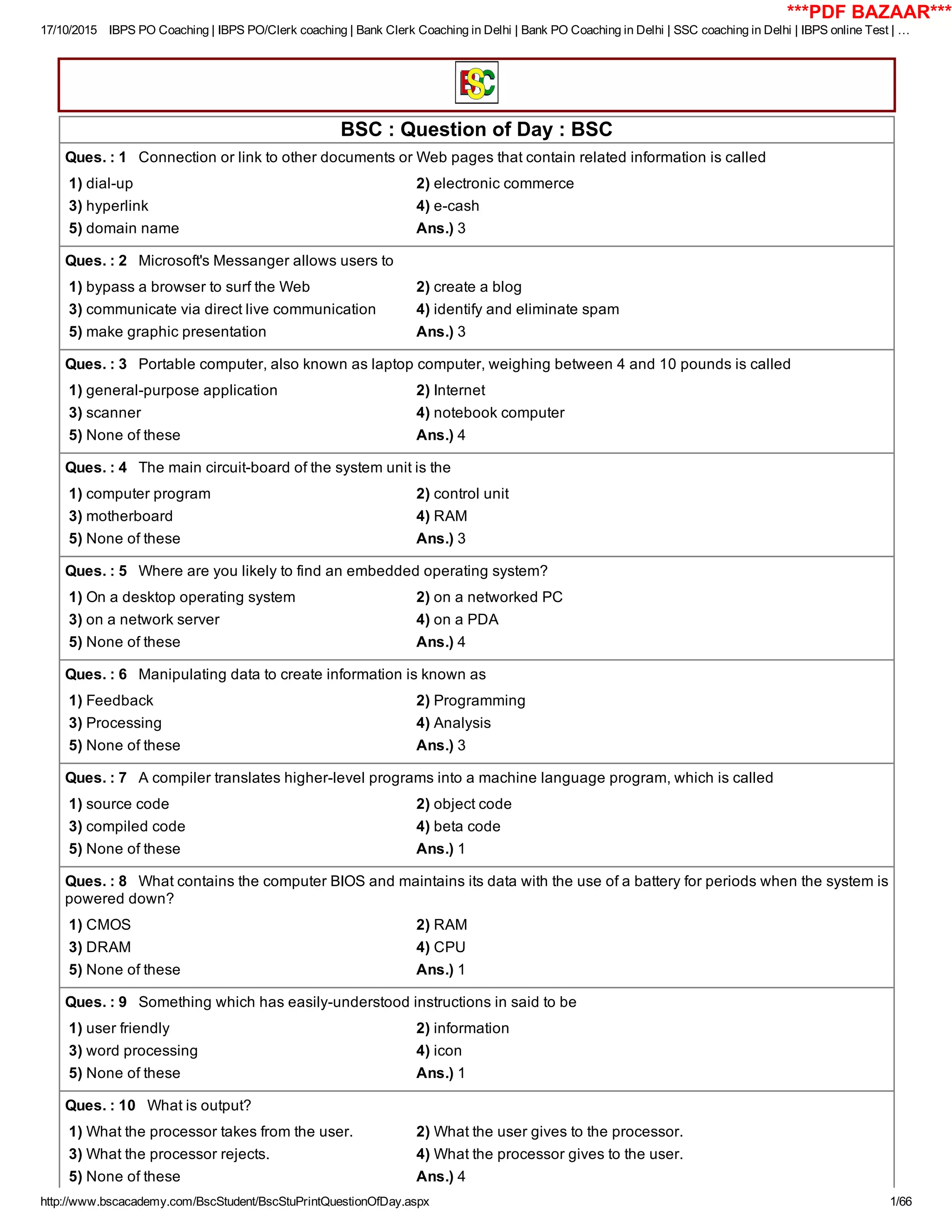 This document contains 43 multiple choice questions about computers and technology. It tests knowledge on topics like hardware components, operating systems, software applications, networking, internet, and security. Each question is followed by 5 possible answers, only one of which is correct. This quiz is likely from an online test preparation site for banking and other competitive exams in India.
