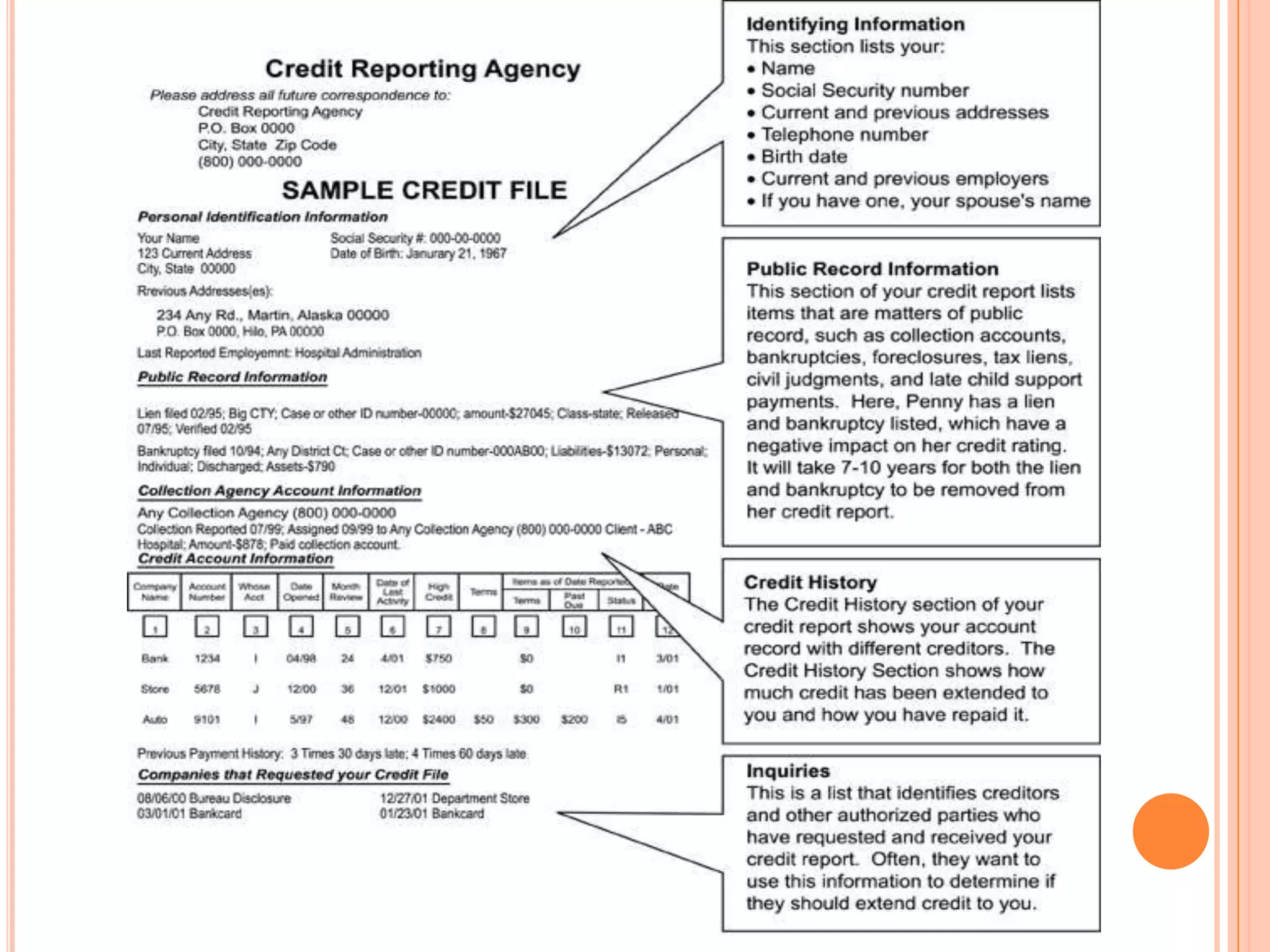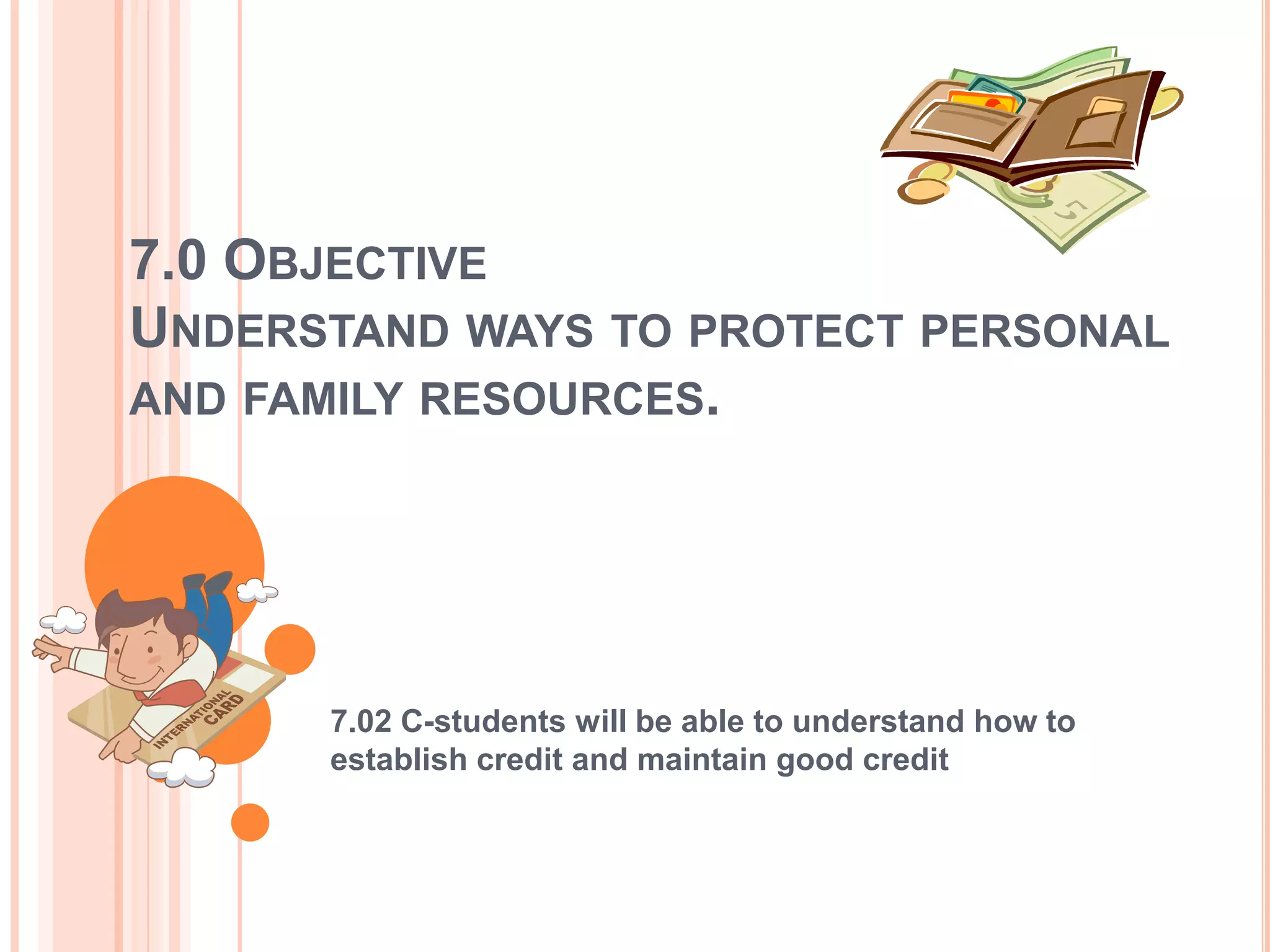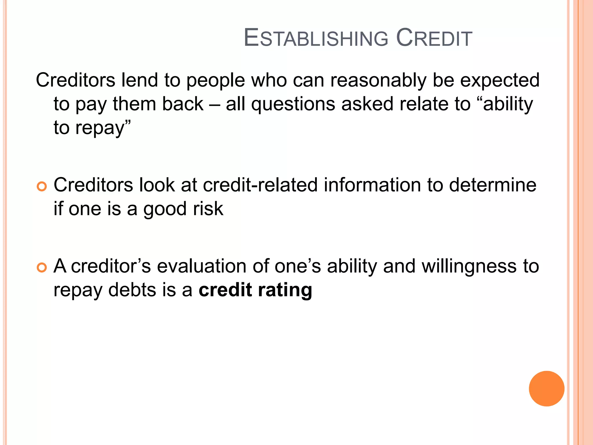 The document provides information on establishing and maintaining good credit. It discusses the importance of creditors evaluating a person's ability and willingness to repay debts through their credit rating and the "3 Cs" of character, capacity, and capital. It offers tips for establishing good credit such as taking out small loans and paying all bills on time. It also covers considerations for choosing credit, types of loan sources, and maintaining good financial habits to protect one's credit rating.