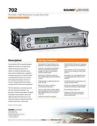 The 702 is a portable, high-resolution 2-track digital audio recorder that records uncompressed audio to removable CompactFlash cards or external FireWire drives. It features two high-quality microphone preamps, AES3 digital I/O, FireWire connectivity, and supports sample rates up to 192 kHz. While compact in size, it provides professional audio quality and flexibility for field recording applications. When used with an external audio mixer, the 702 can serve as a powerful portable recording solution.