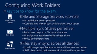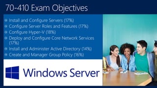 The document outlines an exam preparation session for the MCSA certification focusing on installing and configuring Windows Server 2012. It covers essential exam topics, technical specifications, and practical configuration tasks related to server management, Active Directory, and network services. Additionally, it encourages hands-on practice and provides a schedule for study sessions led by instructors.