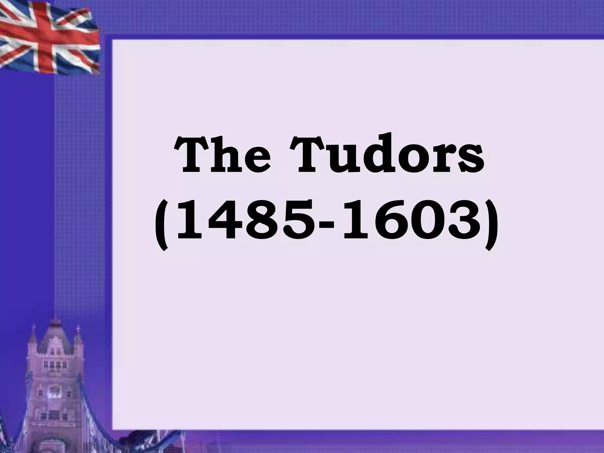 The Tudor dynasty ruled England from 1485 to 1603. Henry VII established a strong monarchy and wealthy nation, while Henry VIII broke England from the Catholic Church and dissolved the monasteries. Elizabeth I defeated the Spanish Armada, establishing England as a major power. However, the Tudors also dealt cruelly with dissent and struggled to control neighboring Wales, Ireland, and Scotland, laying the foundations for future conflicts.
