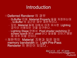 Introduction Deferred Renderer의 경우 G-Buffer 안에 Material Property 들을 저장하는데 , G-Buffer 의 공간은 매우 제한적이다 . 모든 Material 들에 대해서 아주 유사한 Lighting 공식이 사용되는 것을 요구한다 . Lighting Stage 안에서 Pixel shader switching 은 screen space 에서 pixel 마다 발생할 것이기 때문에 아주 비쌀 것이다 . 제한적인 Material 지원과 많은 양의 memory bandwidth 는 Light Pre-Pass Renderer 의 원인이 되었다 .