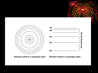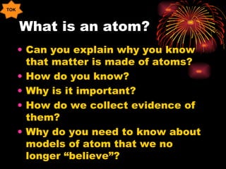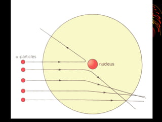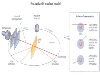 The document discusses atomic structure and models of the atom. It describes J.J. Thomson's discovery of the electron and the plum pudding model. It then summarizes Rutherford's gold foil experiment, which led to the nuclear model of the atom with a small, dense nucleus surrounded by electrons. The document also discusses atomic spectra and how they provided evidence for discrete energy levels of electrons within atoms.