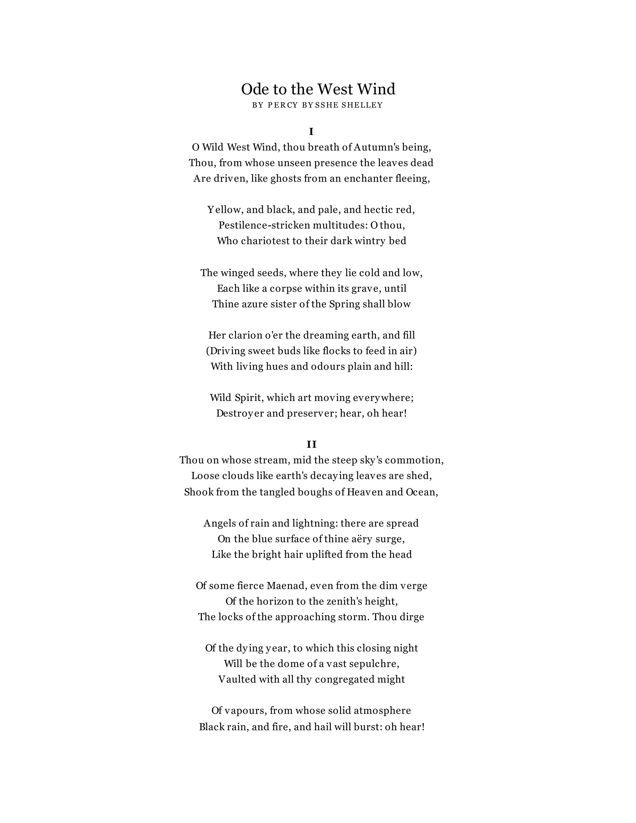 This document contains two poems by Percy Bysshe Shelley. The first poem, "Ode to the West Wind", is an ode addressed to the powerful west wind, asking it to spread the poet's words like leaves and inspire revolutionary change. The second poem, "Ode to a Skylark", celebrates the song of a skylark bird rising higher into the sky as it sings its melodic tune. It marvels at the untamed joy and freedom of the skylark's song.