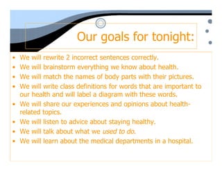 1) Rewriting incorrect sentences, brainstorming health topics, and matching body parts to pictures.