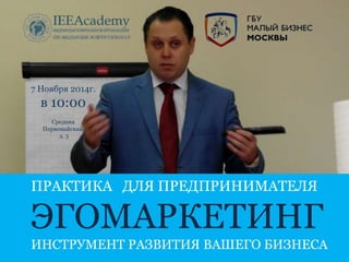 Документ представляет собой содержание семинара по эгомаркетингу, который проходит 7 ноября 2014 года и направлен на развитие бизнеса через личностные компетенции и лидерство. Основные темы включают успех, управление проектными командами, использование инструментов эгомаркетинга для поиска партнеров и построение глобального бизнеса. Также обсуждаются подходы к управлению личными ресурсами и создание инновационных команд.