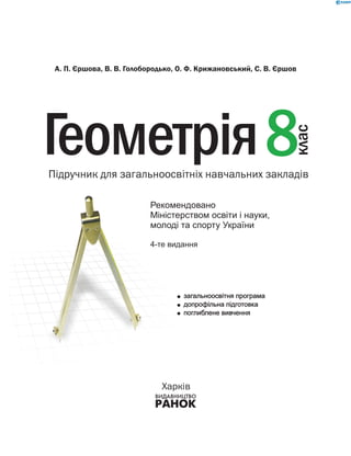 Документ содержит информацию о учебнике по геометрии для 8 класса, изданном под руководством Аллы Петривны Ершовой и других авторов. Учебник включает теоретические материалы, задачи различной сложности и практические упражнения, предназначенные для учеников и учителей. Каждая глава организована структурированно, с вопросами и задачами для закрепления знаний и подготовки к контрольным работам.
