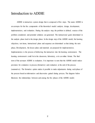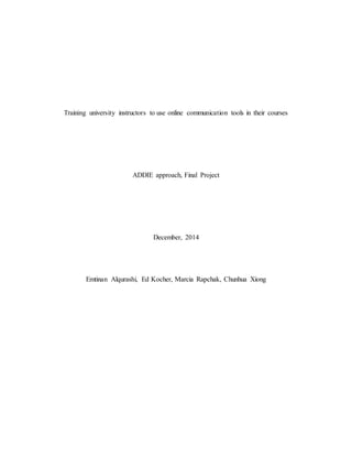 This document outlines the development of an online training course for university instructors on using communication tools in Blackboard. It follows the ADDIE instructional design model, which includes the phases of analysis, design, development, implementation and evaluation. The document focuses on the development phase, providing details on the objectives, standards, strategies and assessment for a sample lesson on creating announcements and voice emails in Blackboard. The goal is to generate and validate learning resources to teach instructors effective online communication skills to enhance student engagement.
